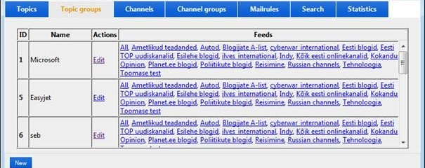 Following image shows topic groups that we have defined. Topic group consists of one or multiple topics. For example topic group "Microsoft" could include "Microsoft, Windows XP, MSFT". All topic groups usable in public portal (or private portal) and also available to be used as RSS feeds to be imported to other information systems or RSS readers. The list of links provides the shortcuts to the same topic group feed in different predefined channel groups. I will talk about channel groups later.