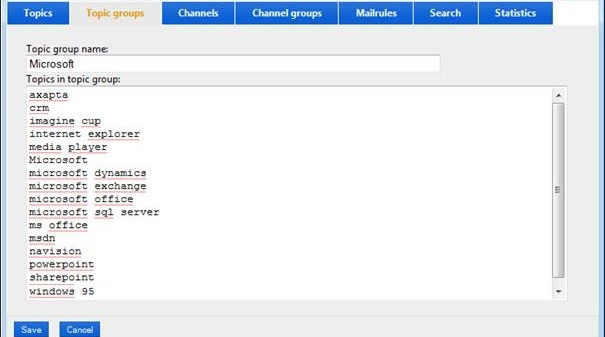 In next screenshot you will see how the topic group is defined. In this example we see topic group called "Microsoft". Each keyword is tracked continuously. You can also define topic groups that share topics/keywords.