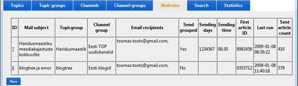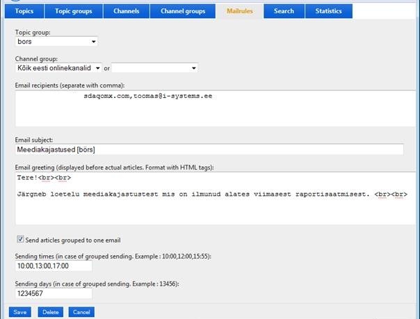 Following images shows you how we define mail rule. First you select topic group and then select one or two channel groups (for example NEWS and BLOGS). After this we add recipients, change subject of email and also email greeting. Finally you can specify if you want to send articles grouped. If you choose to send articles grouped then you also specify the times when to send the articles.