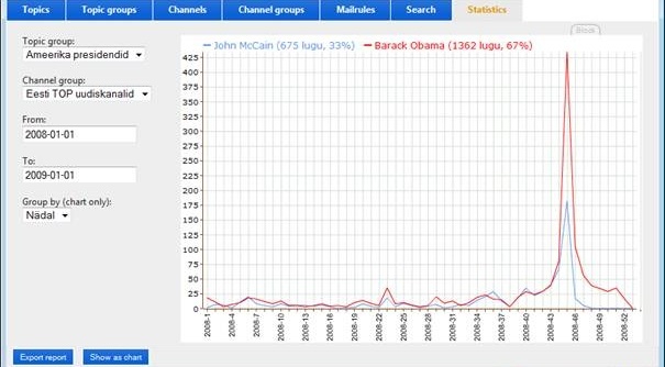 Second output from this application is statistics of mentions. You can select topic group and channel group and then select start and end dates and get the statistics either for use in Microsoft Excel or you can do the visual statistics inside our application and can save the created graphs as images.