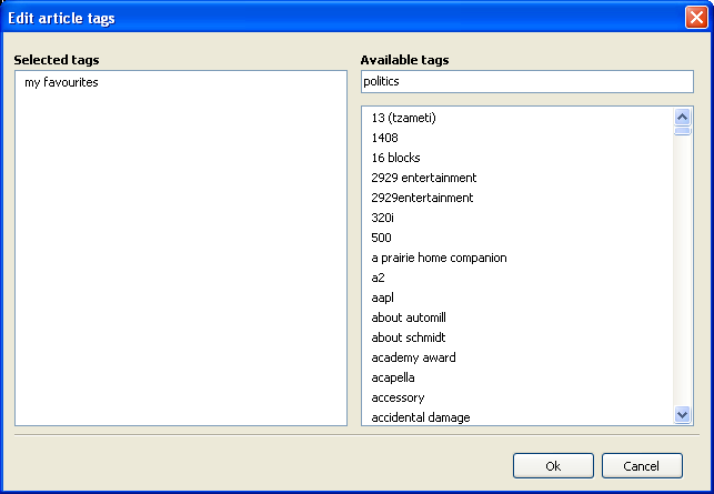 Tag management window has two main parts - selected tags and available tags.