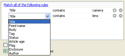 - Feed name – choose on or more subscribed feeds. By using this rule you can limit smartfeed to some newsfeeds. Please make sure that you use „Match all of following rules“ then.