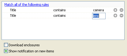 - Enclosure – search for articles which have enclosure/podcast/attachment in them. You can specify if you want to see downloaded enclosures or enclosures of some type (mp3 for example).